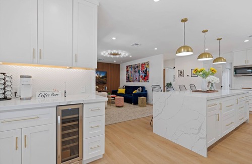 Inside enjoy well designed open floor plan with adjoined living room and kitchen spaces. The kitchen is equipped with a large island with water fall quartz counters and seating for four. Expansive kitchen with plenty of cabinets, counter space and all the necessary cookware, utensils and dining accessories necessary to enjoy a great meal. Additional amenities in the kitchen include, new microwave, range, small appliances, coffee bar, charging station, and under cabinet lights.