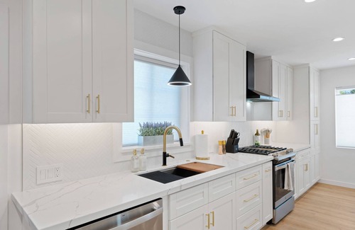 The property is equipped with two gorgeous three piece bathrooms. In the main house, enjoy the spay like feel of this modern bathroom with wall to wall matte white tile, illuminated floating shelves , floating vanity, modern toilet, and custom shower with sleek glass enclosure. Towels, soap, shampoo, conditioner, hair dryer, and other items provided for your convenience.