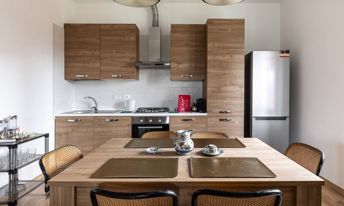 The house, located in Borgo Panigale neighborhood and surrounded by greenery, is located within an exclusive area that features a shared garden with another unit. The entrance opens onto a hallway that leads to the living area consisting of a sitting room with two comfortable sofas facing the TV and a dining table, and an open kitchen equipped with all amenities including an oven, a dishwasher and an espresso coffee machine.