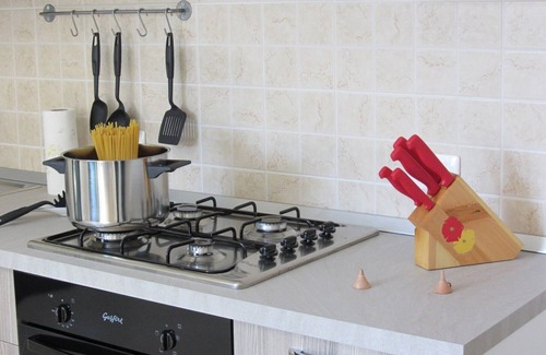 The apartment, which can accommodate up to 5 people, consists of 1 kitchen, 2 bedrooms with double beds and, on request, a field cot or cot, 1 large bathroom with shower and storage room with sink.