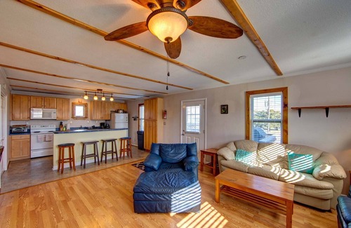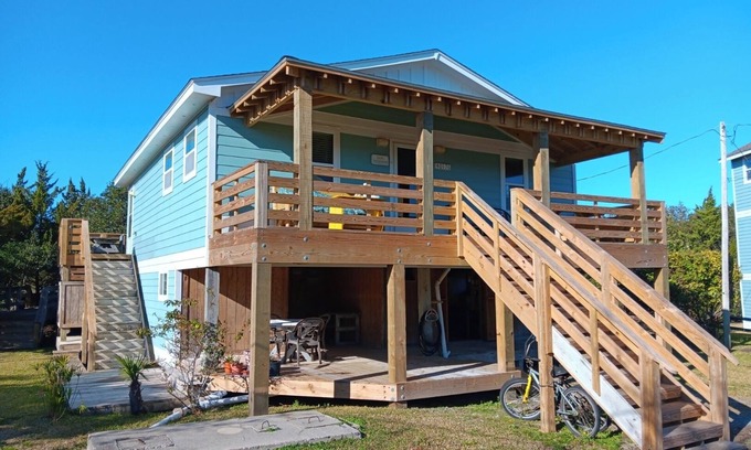 Casa Creekside is a quaint two bedroom home that sits on the back of a residential cul-de-sac and is adjacent Mill Creek, which is directly accessible to the Pamlico Sound. Only two blocks to the ocean, it sleeps 4-5 and features outdoor living amenities like two private upstairs decks and a hot tub overlooking the creek.