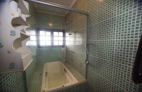 - O banheiro possui chuveiro elétrico, box de vidro/acrílico e banheira