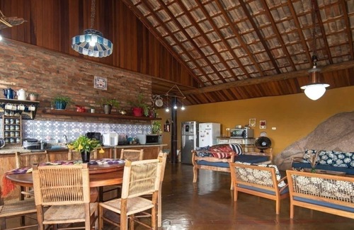 A área de lazer é um dos principais atrativos da casa, com piscina, churrasqueira e horta. Os hóspedes podem relaxar nos balanços, redários ou aproveitar o playground infantil para as crianças.