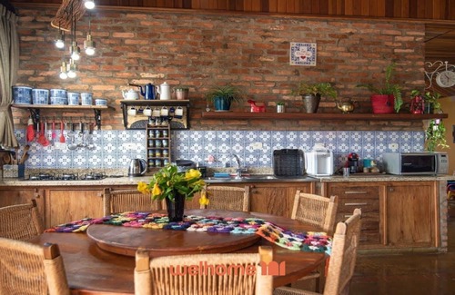 A cozinha é totalmente equipada, com geladeira, fogão, micro-ondas, cafeteira, liquidificador, sanduicheira, forno, airfryer, panelas e utensílios básicos, ideal para preparar refeições para toda a família. O espaço de lazer externo conta com churrasqueira, piscina, balanços, redários, assentos ao ar livre e uma horta, onde os hóspedes podem colher ingredientes frescos.
