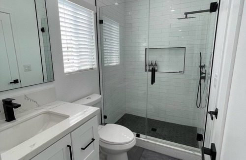 Welcome to our brand-new, beautifully designed 2-bedroom home in Santa Ana. Each bedroom features a king bed, dresser, walk-in closet, and smart TV, providing ultimate comfort during your stay. You'll also enjoy the convenience of private full-sized restrooms in each bedroom, complete with toiletries, hairdryers, and rain-type showerheads for a luxurious experience.