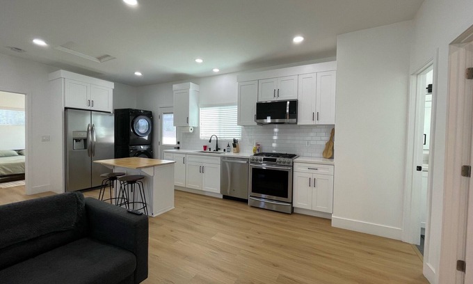 Our home is designed with a modern, minimalist aesthetic and built with high-quality materials. Enjoy luxury vinyl plank flooring, quartz countertops, and a fully stocked kitchen. Each room has its own air conditioning unit for both hot and cold air. High-speed Wi-Fi and an in-unit washer and dryer make your stay even more convenient.