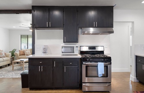 - Fully equipped kitchen with full-size fridge, stove, oven, microwave, and dishwasher