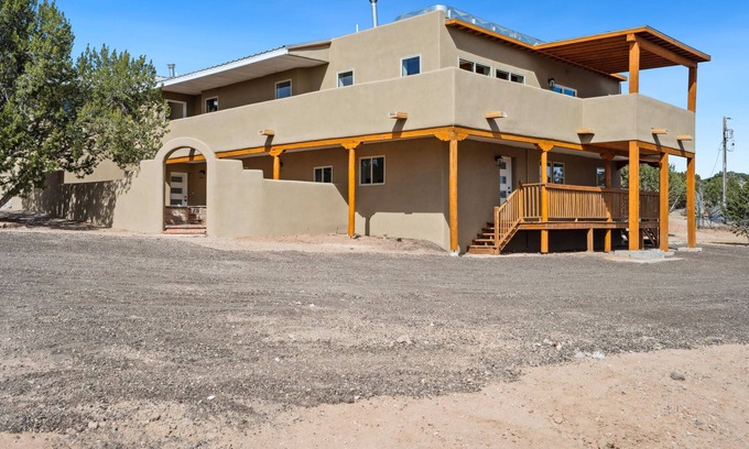 Escape to this stunning 7BR, 4.5BA Santa Fe estate blending classic adobe charm with modern luxury. Perfect for families and groups, it offers a spacious gourmet kitchen, cozy electric fireplace, and breathtaking desert views. Relax under the covered portal, stargaze at night, or explore nearby historic Santa Fe. Ample space indoors and out makes it ideal for retreats or reunions. Experience true Southwest magic in total comfort and privacy!