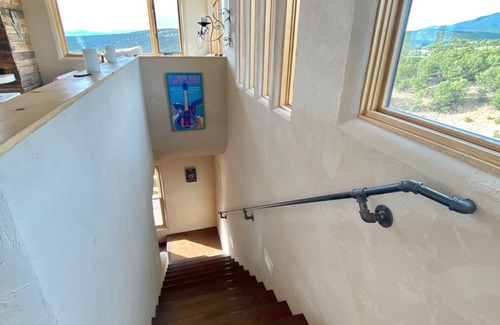 The views from the second-story art-studio-living-area are THEE best in Taos--360 degrees of turquoise skies and mountains and sunrises and sunsets. Watch the moon rise, watch the sun rise and sun set..from the art studio-heaven! (Dave designed this 1000-square foot addition and has done all of the remodeling.)