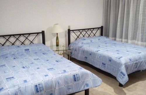 Habitación con dos camas matrimoniales y baño privado, entrada independiente y terraza al aire libre