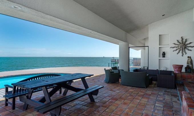 As you step out on to the back patio you are greeted with panoramic views of Aransas Bay, a large private swimming pool and several areas to sit and relax and bask in the sun.