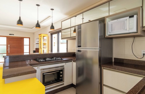 - Cozinha estilo americana equipada com utensílios e eletrodomésticos para preparar e servir suas refeições no conforto do local;