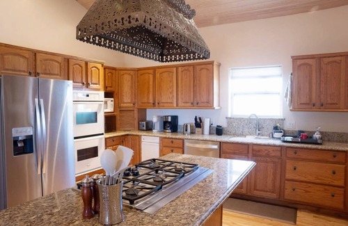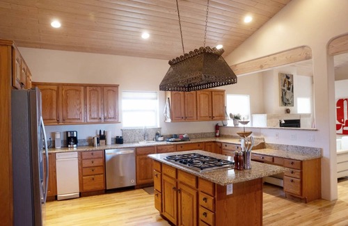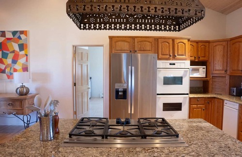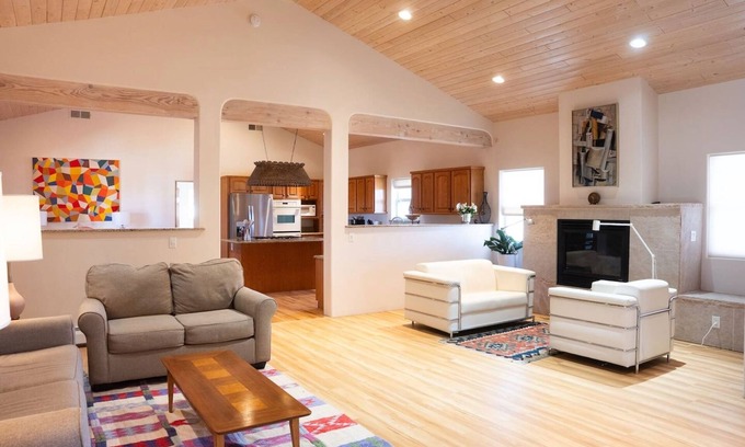 As a family of working artists represented on Canyon Road at Nuart Gallery, we’ve filled the home with our original contemporary artworks, creating a vibrant and inviting atmosphere that reflects the creative spirit of Santa Fe. The high ceilings and open layout give the house a bright, airy feel, while the spacious, fully equipped kitchen is perfect for cooking meals at home or entertaining guests.