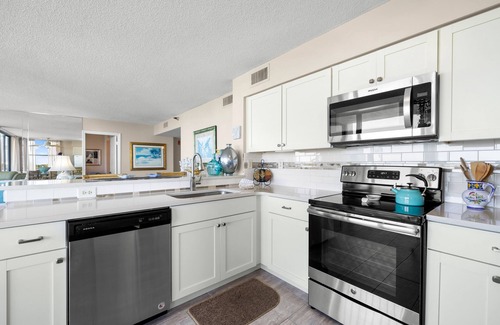 The fully equipped kitchen features modern appliances, ample counter space, and all the cookware and utensils needed to prepare your favorite meals. A dining table for four and breakfast bar seating make it easy to entertain or enjoy casual meals with a view. Whether you're cooking dinner or warming up appetizers, everything you need is close at hand.