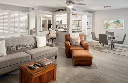 Discover your tropical oasis in the desert, situated within walking distance of Scottsdale Fashion Square and Old Town's vibrant scene. Enclosed in a gated community, guests have access to the pool and tennis facilities. The home’s heart is an open-plan living space bathed in natural light from soaring clerestory windows and adorned with beautiful local art and comfy seating. Step out to a patio, where a BBQ grille stands ready for al fresco dining amidst the tranquil greenery.
