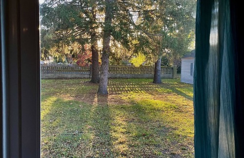 Enjoy our cozy one level, two bedroom home with a deck that is perfect for outdoor dining. The home has character and an open floor plan, seeing from the dining room to living room and den. Located on a spacious 1/4 acre lot, you can watch the sunrise from the deck or your bedroom, and see the sunset from the front porch or dining room. The patio is great for relaxing, entertaining, overlooking the lush green pines and blue hydrangea.