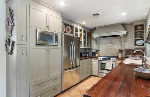 The four bedrooms and multiple beds and futons in this vibrantly colorful hacienda-style guest house comfortably sleep up to a dozen people-and if you book the Casita as well, up to 14. Three full bathrooms include shower stalls, and all the soft and comfy bed and bath linens you'll need are provided. Ample seating is available in the two roomy living areas and dining section, and the kitchen is fully equipped with a fridge, stove, microwave, toaster, and regular coffee maker. Smart TV, Wifi, great cell service, and climate-controlling central air and heating fill out the list of the tech and entertainment amenities here.