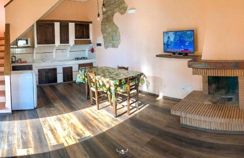 The house is spread over two levels. On the ground floor, there is a spacious living area, featuring a charming built-in kitchen (equipped with an oven, dishwasher, stovetop, and refrigerator), a TV, and a fireplace.