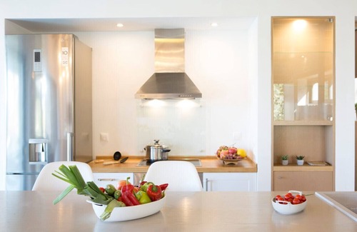 Apart from the living room, the same space includes a modern gourmet kitchen with all appliances, sink, cooker, oven, fridge-freezer, dishwasher and washing machine. The kitchen offers generous seating for seven people.