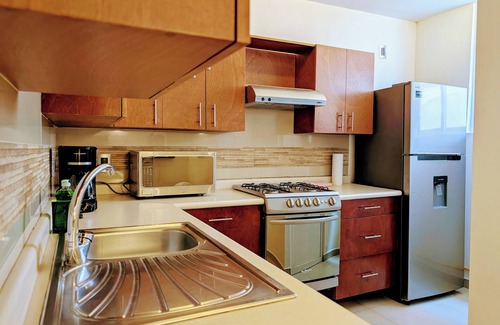 This spacious apartment has a maximum capacity of up to six people (the base rate is for two people; additional guests incur an extra cost). It features two large bedrooms, two double beds, and Queen bed, 1 full bathroom equipped with towels and essential toiletries and a half bath. It includes a living room, free Wi-Fi, and a Smart TV for your streaming apps. The kitchen is fully equipped with a dining area. For guaranteed early check-in (from 6 a.m.) or guaranteed late check-out (until 8 p.m.), the cost is $1000 MXN with advance payment. These options are subject to availability.