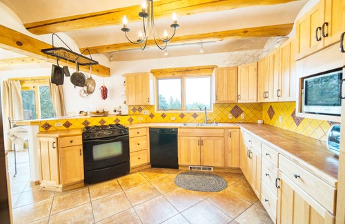 Nestled among pinion, juniper, and ponderosa pines, our hand-crafted, custom-built, non-smoking home is designed to maximize the breathtaking views. The modern home boasts coved plaster ceilings, log vigas, and a traditional northern New Mexico colonial-style pitched roof. It’s many windows provide ample natural light and frame the mountain views, while the southern exposure helps keep the house warm and bright all winter. Take in the views from the expansive covered porch or one of the two private upper balconies or relax on the large south-facing deck.