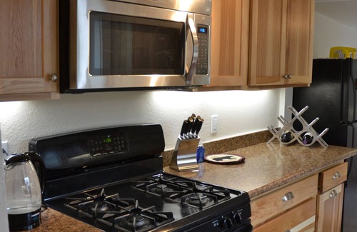 The kitchen is fully stocked with dishes and utensils and the dining table comfortably seats four and does have an additional leaf to seat a few more. The living room has a L-shaped couch, large ottoman, a Samsung 40" tv with DirecTV and high speed WiFi.
