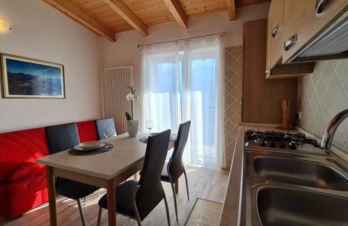 Casa Elka apartment 8 can accommodate up to 4 adults and 1 child, has 2 bedrooms, one with a double bed and the other with a bunk bed, a living room with a French sofa bed, 1 bathroom, and well equipped kitchen. A furnished balcony with stunning lake view will complete the vacation of your dreams.