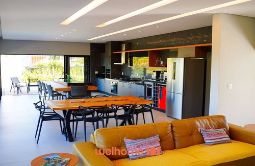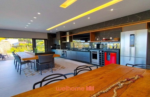 A cozinha é totalmente equipada com fogão, forno, micro-ondas, geladeira, freezer, frigobar, lava-louças, liquidificador, torradeira, sanduicheira, chaleira elétrica, louças, panelas, taças de vinho e utensílios de churrasco, proporcionando praticidade e integração.