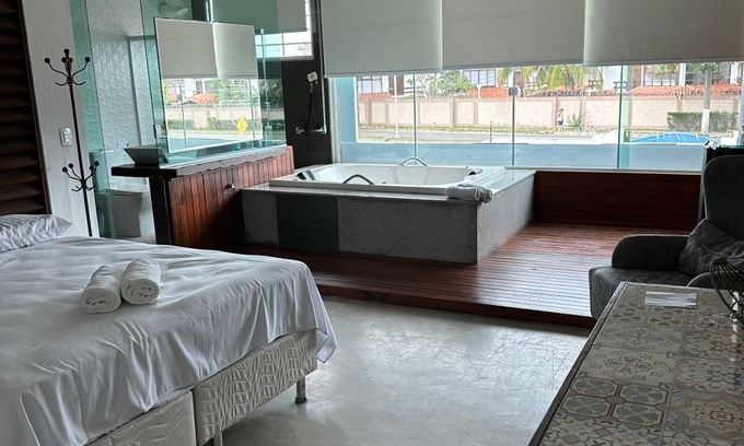While you're here, you can enjoy all the comforts of home and more, including a jetted bathtub and a pool, as well as internet and air conditioning. Other amenities include towels.