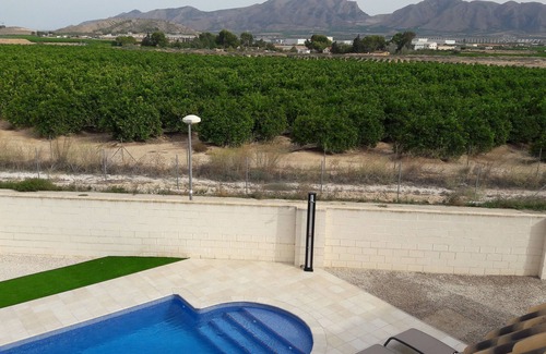 Near to Fortuna, in Murcia province, 3 bedroom, 2 bathroom detached villa with fantastic 10m X 5m swimming pool and surrounding terrace. Located in a quiet urbanization with views over orange and lemon groves towards a mountainous backdrop in the distance. Approximately 40 minutes drive from Alicante Airport via the E15 motorway, the property is set inland and ideal for those clients wanting to stay in real Spain away from tourists, to enjoy a quieter break away, exploring the surrounding area. Available for short breaks, weekly and monthly rentals including longer term winter lets for Snowbird clients looking to escape colder climates. Very attractive monthly rates available November through to February inclusive. Car rental is essential.