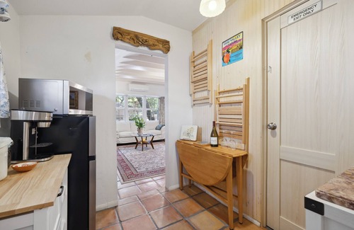 Nestled in the Ojai Valley's Meiners Oaks, affectionately named "Mo Town", this delightful studio is a wonderful retreat for guests. With its charming decor and natural light, this cozy space offers a comfortable country retreat. The sleeping space features a high quality queen bed with high quality linens, ensuring a restful night's sleep. The bathroom is equipped with a refreshing shower, hair dryer, fresh towels and toiletries for your convenience. Stay connected with WiFi and Direct TV. Includes a minisplit for dedicated heating and AC, that guests control. Kitchenette is equipped with mini fridge, freezer, microwave, induction plate, tea kettle and coffee maker-sorry no stove. Although this studio is connected to the main house privacy is guaranteed. Includes private off street gated parking and EV charging is available on request. Casa Esquina is just a short 7 minute drive to downtown Ojai and sits with convenient access to both highway 150 and the 33.