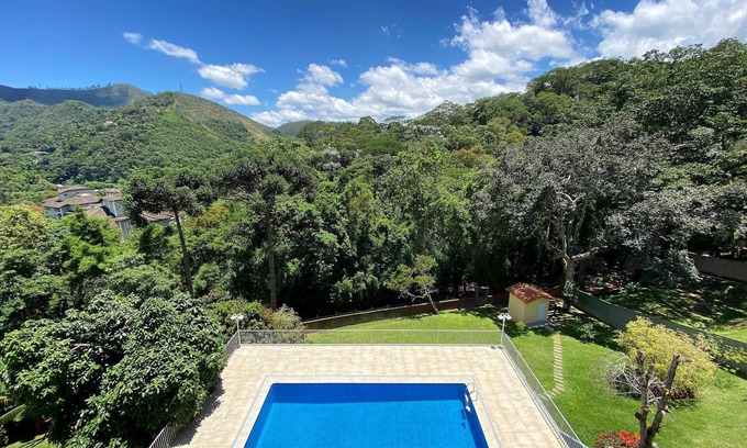 Casa Feliz at Itaipava, Petrópolis, is perfect for large families looking for the best of the mountains with great comfort. Very equipped, the house has 7 bedrooms, 5 of which are suites, all with air conditioning. We accommodate up to 18 people with all comfort. For leisure, a huge swimming pool, two gourmet areas (one for summer and one for winter), TV room, whirlpool and more. Located in a gated community in a prime location, with easy access via BR040 highway. Includes daily maid service.
