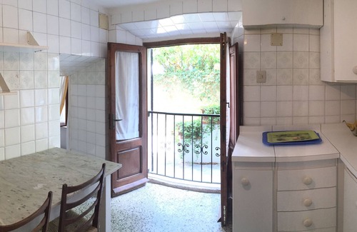 This apartment has a large independent garden (about 1000 square meters with many colored trees and bushes) with entrance from the street and with private parking. It consists of entrance hall, living room with sofa bed (single), fireplace and TV, 2 bedrooms (one double and the second with a bed plus a bunk bed), well-equipped eat-in kitchen and with washing machine, bathroom with shower and hairdryer.