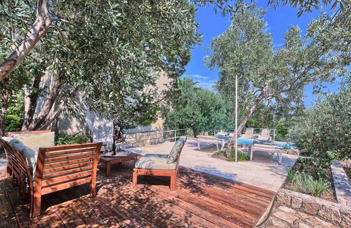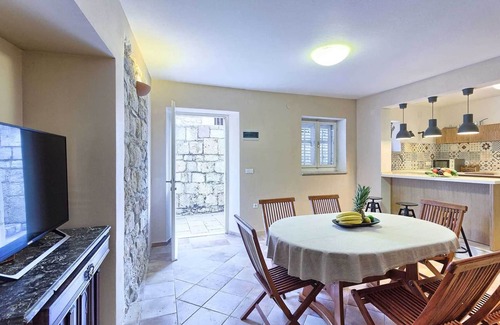 Charming garden oasis consisting of three separate living units, each with its own two bedrooms, two bathrooms and a lounge with a flatscreen TV, ideal for multiple families looking to vacation together without compromising privacy. The authentic villa boasts regional charm with exposed stone walls, wood beams and a large stone fireplace. Fully equipped kitchen with a dining room is in a separate unit accessible to all. The outdoor garden impresses with lush rose bushes, olive and palm trees and aloe plants and yields breathtaking views of the sea and the neighboring islands. Heated pool is also provided for your enjoyment, as well as built in BBQ facilities, alfresco dining tables and plenty of shaded seating areas. Casa Garden invites you to relax, enjoy quality time together, time apart, and indulge your holiday. The beach is a whole 4-minute walk away.Welcome to Dalmatia.