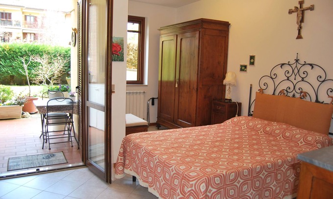 Two gardens, room with exit to the entrance garden. In the ONLY ROOM there is both the DOUBLE BED and a BED used as a sofa. On request TRAVEL BED for BABY. Bathroom with shower and bidet and kitchen with small terrace, ideal for quiet breakfasts and outdoor meals and the patio below ideal for sunbathing. The kitchen is equipped with gas stove, oven, refrigerator, toaster, microwave, cooking pans and pots, cutlery.