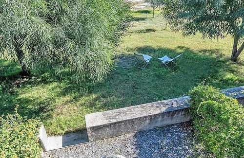 The patio is 25 square meters (270 square feet) large. It is partly shaded by a roof and by trees. It is equipped with a table, chairs and two deck chairs. From the patio you will enjoy a charming view of the beach and of the sea.