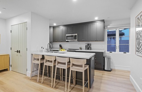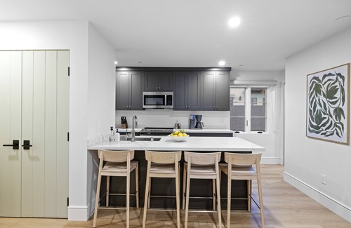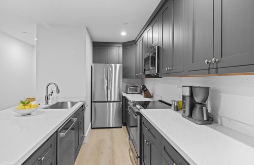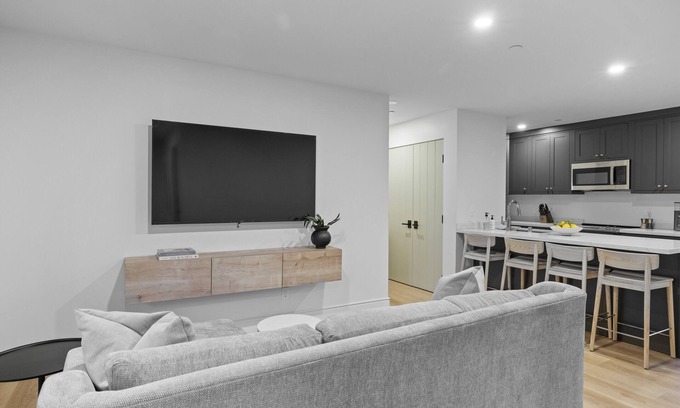 The primary bedroom of this 843 sqft unit has a king-sized bed and a private en-suite bath with dual-sink vanity and shower. The secondary bedroom has a queen-size bed and a private en-suite bath with a rain shower/tub combo. The living room Crate & Barrel sleeper sofa sleeps two guests on a comfortable queen mattress. The full kitchen has all stainless appliances with an open-concept living and dining room. In addition, there is an in-unit washer/dryer, a flat-screen smart TV with streaming, casting, or Airplay features, and a Samsung split heating/AC system in all rooms for ultimate comfort.