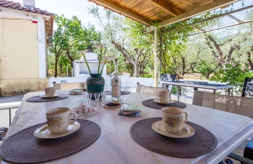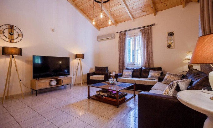 Discover a serene escape in this charming three-bedroom home, where comfort meets nature in perfect harmony. Step inside and enjoy two spacious living rooms with a TV 55''—ideal for relaxing or entertaining—alongside a well-equipped kitchen ready for home-cooked meals. Each of the three bedrooms is thoughtfully designed to offer rest and relaxation including a wardrobe and air-conditioning. The two bedrooms offer a double bed and the third bedroom provides two double beds. The bathroom is thoughtfully equipped with all the essentials, ensuring comfort and convenience. Outside, unwind in a beautifully landscaped space featuring comfortable furnishings and enveloped by the soothing presence of olive, lemon, and orange trees. Set on 3,000 square meters of lush land, this property offers a perfect blend of privacy and natural beauty.