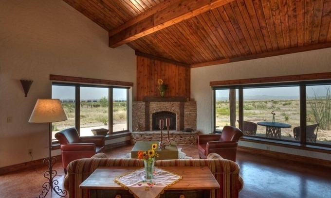 3 minutes from the heart of Marathon, Texas, there's a retreat that's unforgettable. From sunrise to sunset, the landscape is alive with wildlife and a peaceful quiet that will calm your mind and sooth your soul. Walk out onto the covered patio to observe birds, butterflies, geckos, turtles and frogs in your own private preserve. Unwind to a view that goes on forever.