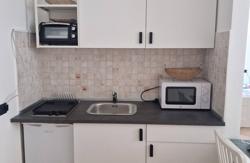The kitchenette is equipped with an oven, a stovetop, and a refrigerator, as well as a coffee maker, an electric kettle, and a microwave. Bathroom amenities include a hair dryer, a bidet, and towels. Other amenities at this 1-bedroom, 1-bathroom rental include bed sheets, air conditioning, heating, and a dining table.