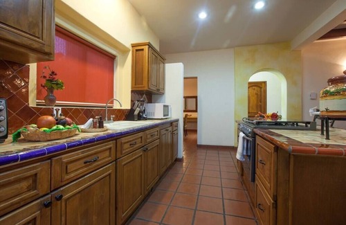 Traditional ceramic floors and intricate murals cover the well-lit, rustic rooms, all of them vibrant with the colors and textures of Mexico.