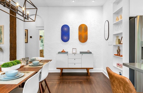 As you enter the home, the first thing you’ll notice is the cozy office nook—bathed in natural light, it’s the perfect place to check in on emails or indulge in a good book. The vintage charm here sets the tone for the rest of the house, where thoughtfully selected designer Mid-Century and Bohemian furnishings enhance the atmosphere.