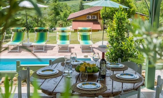 Casa Magica is a charming holiday house with private pool in Le Marche region and rises on top of a hill in San Lorenzo in Campo, where you can enjoy a breathtaking view over the surrounding valley. The property consists of two completely independent units, one of which belongs to the owner who lives there alone. He’s a very discreet and friendly person always ready to welcome his guests. There is a swimming pool for private use and a garden equipped with tables and chairs for al fresco dining.