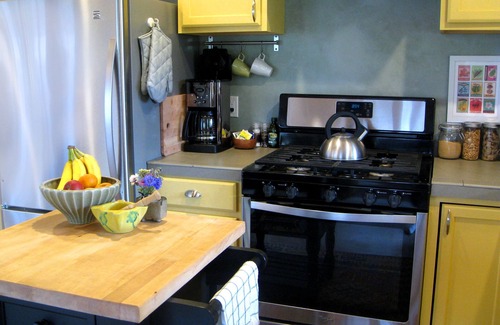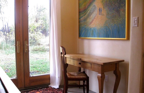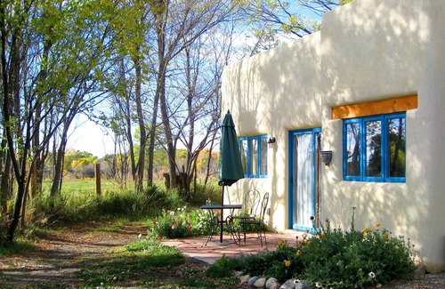 Our casita greets its guests with a long shaded porch, to sit and enjoy nature and the gardens, or savor a relaxed meal outdoors, with a view of Taos Mountain. Inside the 800 sq.ft. house is a spacious, open floor plan with pastoral and private views through its many windows. The main area hosts a fully equipped kitchen, dining area, and living and lounging spaces, including a cozy window seat The living room area has an L shaped couch that converts to a very comfy double bed. The bedroom features a queen-sized bed and french patio doors to view Taos mountain and morning sunrise.