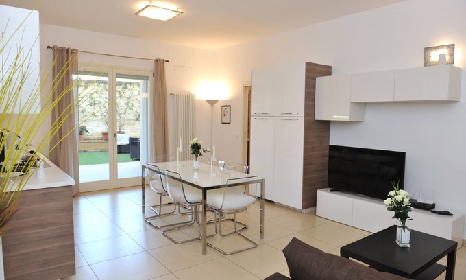 The aim of our structure is to make our guests feel "at home" by providing them with an extremely comfortable three-room environment, fully furnished and equipped with all the options: gardens, video intercom, climate control, air conditioning, kitchen (pans, dishes, coffee stain, kettle, toaster, oven, fridge, freezer, dishwasher), necessaire for washing and ironing (washing machine, clothesline, iron and ironing board), bathroom products (towels, towels and bath products, slippers), 2 TVs flat screen, SKY cinema, internet, excellent safety equipment (armored door, railings, safe). Casamassima is located in the metropolitan area of Bari in a strategic area for both business travel and tourism. It is on the Bari-Taranto directive, a short distance from both Bari (17 km) and Taranto (66 km), it allows rapid travel through the adjacent state road 100 and the A14 motorway, access to which is only about ten kilometers away. Casamassima has a large wholesale mall "il Baricentro" and there is the largest retail mall in the south (Auchan, Leroy Merlin, Decathlon, The Space Cinema ...).