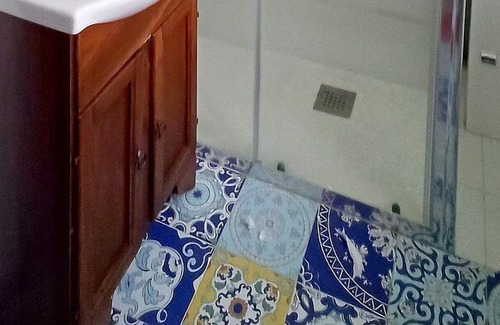 The bathroom is decorated with majolica tiles and equipped with a washbasin, a toilet, a fully enclosed shower and a hairdryer. You will be able to enter the bathroom from the living room.