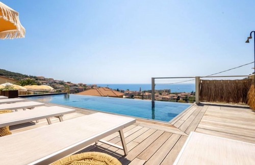 Modern, luxurious residence "Casa Mia", built in 2023. 5 apartments in the residence. In the centre of San Lorenzo al Mare 25 km from the centre of San Remo, 5 km from the centre of Imperia Porto Maurizio, 90 km from the centre of Nizza, in a sunny, elevated position in the residential district, 400 m from the sea. For shared use: swimming pool (3 x 9 m, depth 140 cm, seasonal availability: 01.Jan. - 31.Dec.) with salt-electrolysis pool-cleaning system. Outdoor shower, terrace (150 m2), garden furniture, pool maintenance by the owner/gardener. In the house: reception, WiFi, storage room for bicycles, sun terrace, roof terrace, washing machine, tumble dryer (for shared use). Parking (for 6 cars). Grocery, supermarket, restaurant, bar, bakery, café, pedestrian zone, bicycle rental, bus stop 400 m, sandy beach. Minigolf 600 m, cycle lane 400 m.