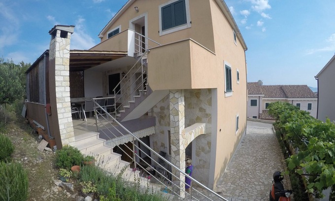 Het vakantiehuis heeft 2 appartementen, die kunnen allemaal tegelijk verhuurd worden, de eigenaar woont op de begane grond. Het huis bevind zich op een rustige plek c.a. 300 meter van de zee vandaan. Elk appartement bevat een airco, een keuken met een vaatwasser, ceramische kookplaat, oven, magnetron, koffiezet apparaat en een grote koelkast met diepvries. een slaapbank 160x200, sat TV, WIFI, toilet met douchecabine en 2 aparte slaapkamers met een 2persoons bed. Elk appartement heeft een balkon met een uitzicht op zee. Het huis bevat een gezamenlijk overdekt terras en een BBQ. Het huis bevat ook parkeerplekken. Het strand dat vlakbij het huis gelegen is, is erg kindvriendelijk. Het is een rustig strand met kiezelsteentjes. Er zit een leuk strandcafe/restaurantje, douche en animatie voor jong&oud. Het strand bevat ook een duikschool, hier kunt u duiklessen nemen om de mooie onderwaterwereld te bezichtigen van Kroatie. In een straal van 1,2 km vind u een huisartsenpost, een supermarkt, apotheek, bank, postkantoor, groene markt en veel restaurantjes met kroatische specialiteiten, maar ook pizza, pasta en andere deegwaren. Vlakbij deze winkeltjes bevind zich een groot strand met enorm veel beach-clubs en animatie voor jong&oud. Het strand is c.a. 1km lang. De oudste stad van Kroatie, Trogir, is op een afstand van 4 km. Deze stad is zeker de moeite waard om te bezoeken.