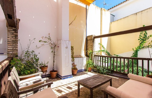 The house is of traditional Sevillian architecture and has a zaguan - tiled entrance with a wrought-iron gate - and a central patio that keeps the ground floor cool during peak summer heat. The patio has a confortable seating area and a fountain with plants.