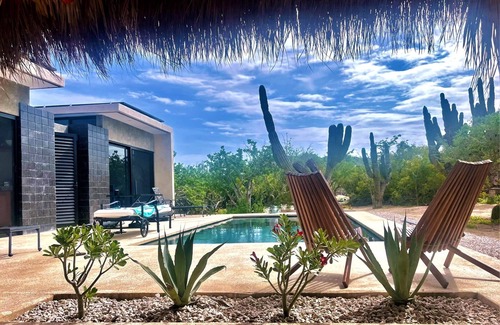 We offer two booking options depending on the number of people in your party. THIS OPTION INCLUDES TWO POOLSIDE CASITAS with a tranquil lounge pool and a palm-thatched roof palapa surrounded by giant Cardón Cacti and gardens that complement the natural scenery. A newly built rooftop patio is the cherry on top. You won't want to miss the sunsets from this incredible vantage point!